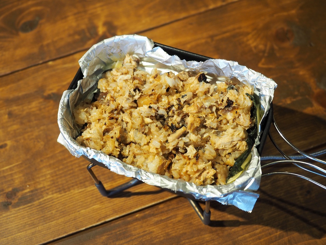 で、ここからが真骨頂。アルミホイルを両手でつまんでそのまま同じフライパンの上でひっくり返します。