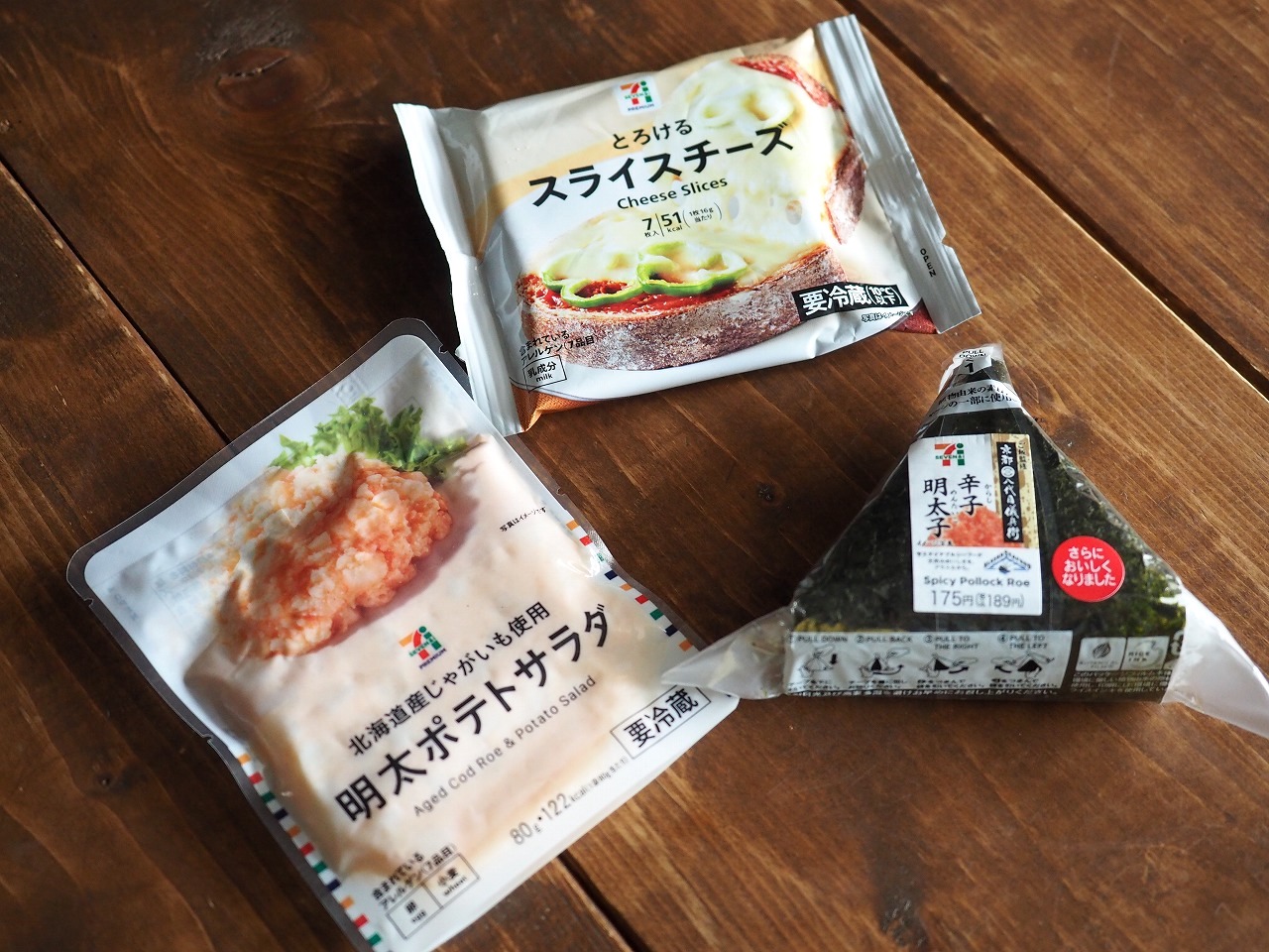 まずは辛子明太子のおにぎり。それに明太ポテトサラダ。それと「とろけるスライスチーズ」の3つ。
