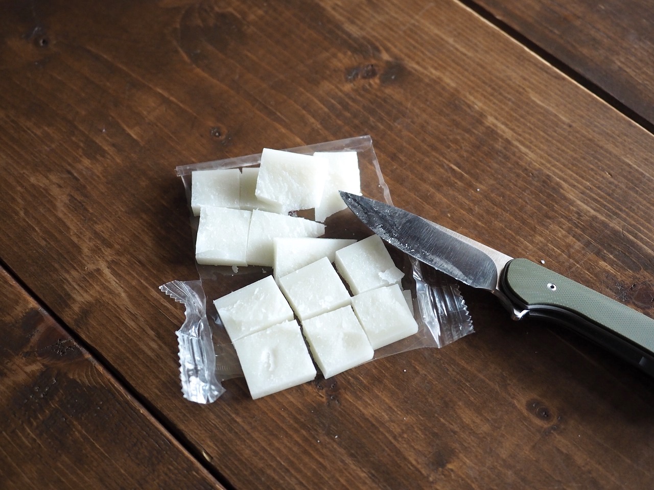 まずはモチをナイフで縦に半分に切って、さらに小さくカットします。意外と切りやすいです。