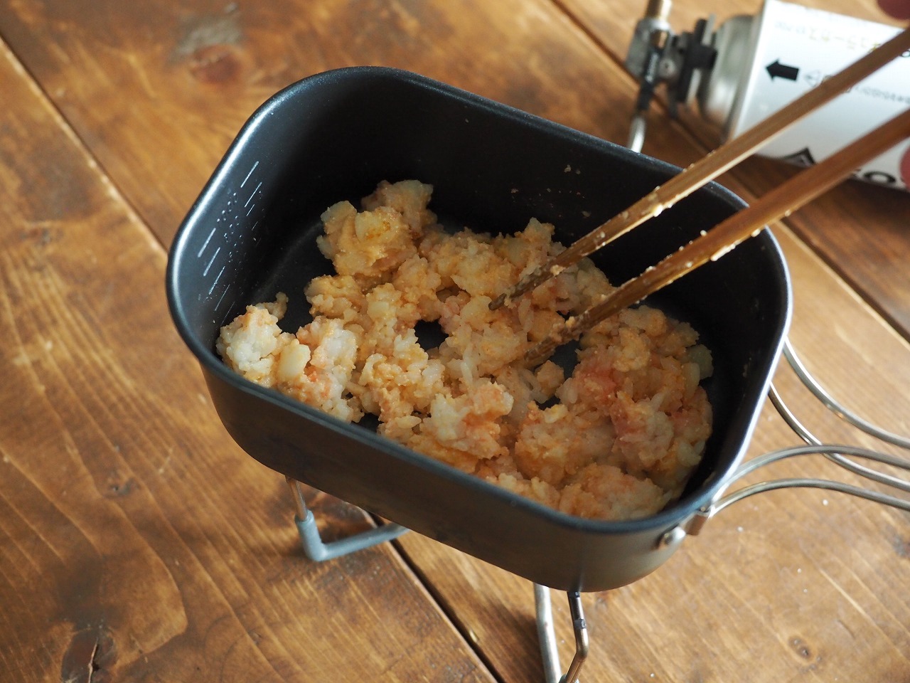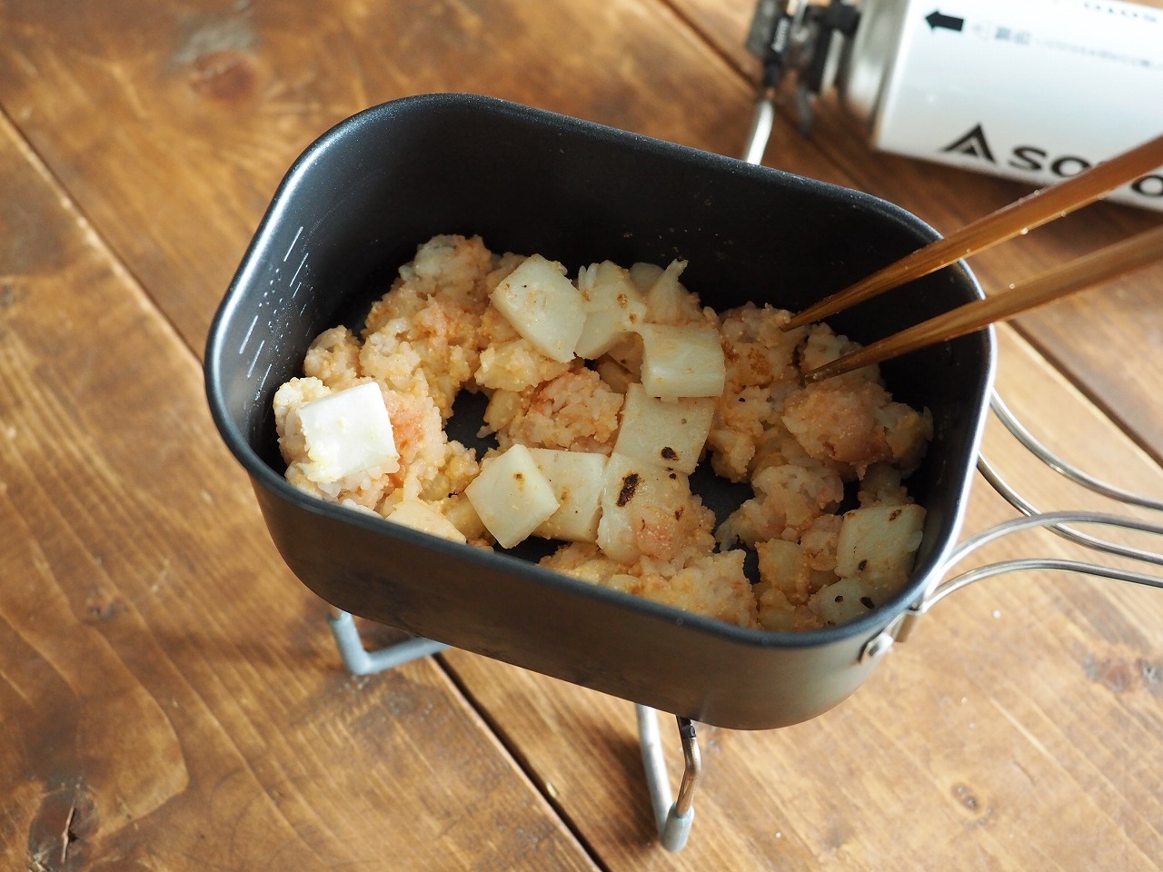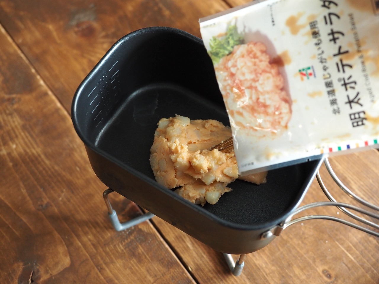 それから、火をつける前にコッヘルにポテトサラダをあけます。