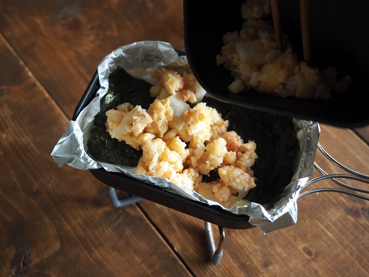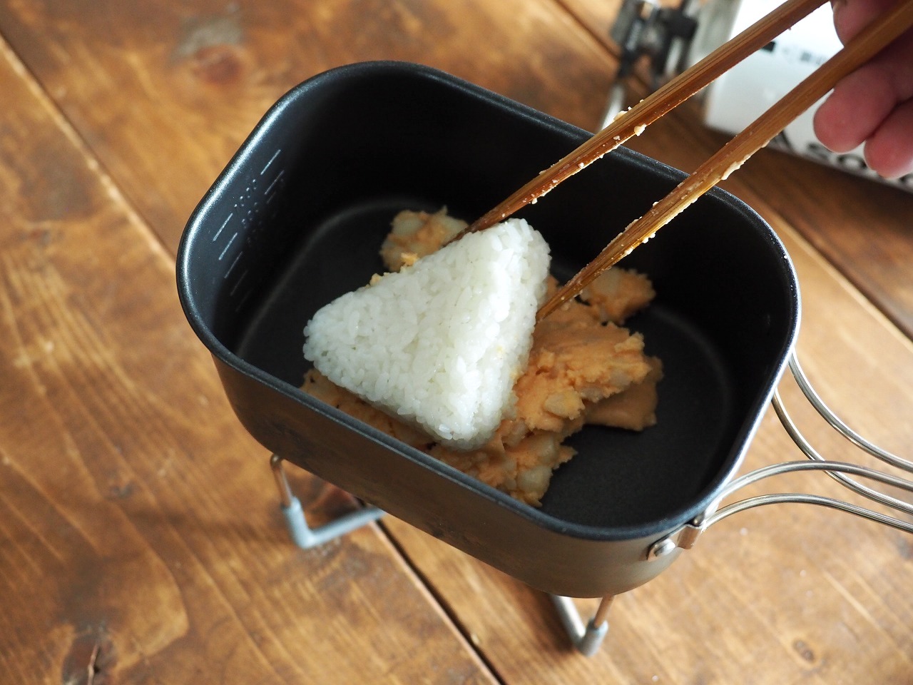 コッヘルの中身を入れて並べます。モチが偏らないようにキレイに敷きましょう。
