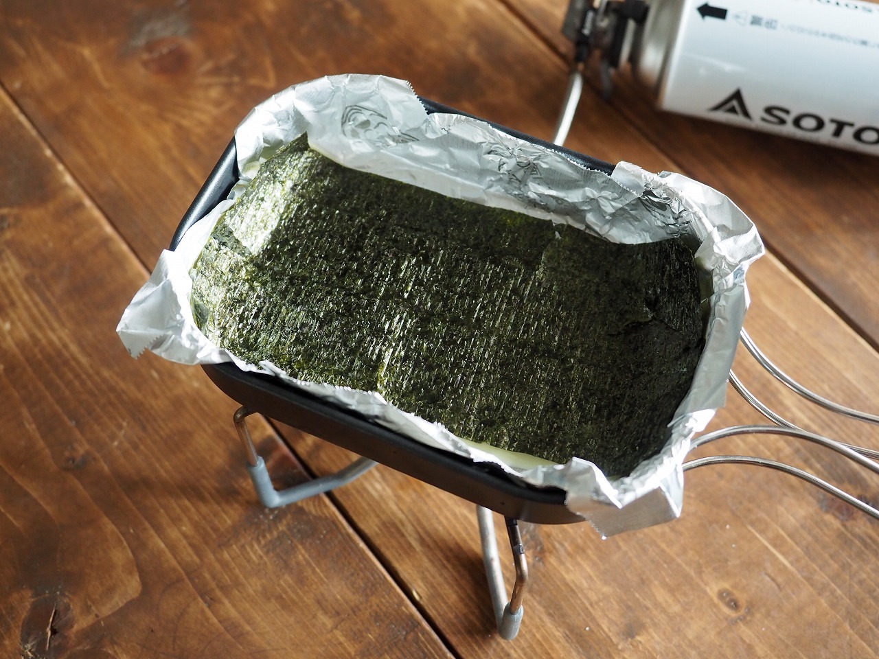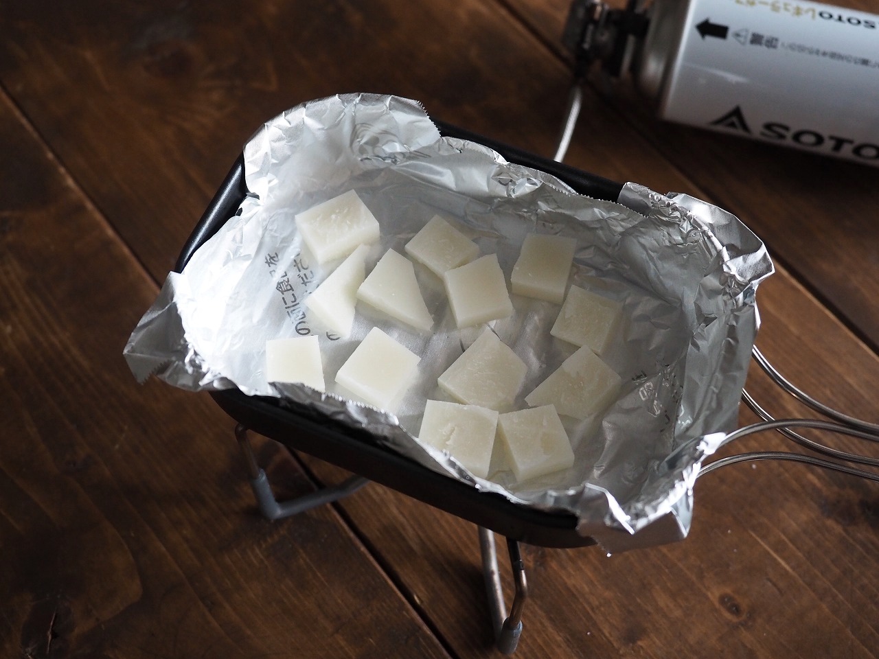で、コッヘルは横に置いておいて今度はフライパン。テフロン加工のアルミホイルを敷いてからモチを並べて弱火で加熱します。両面焼いて柔らかくなったら……。