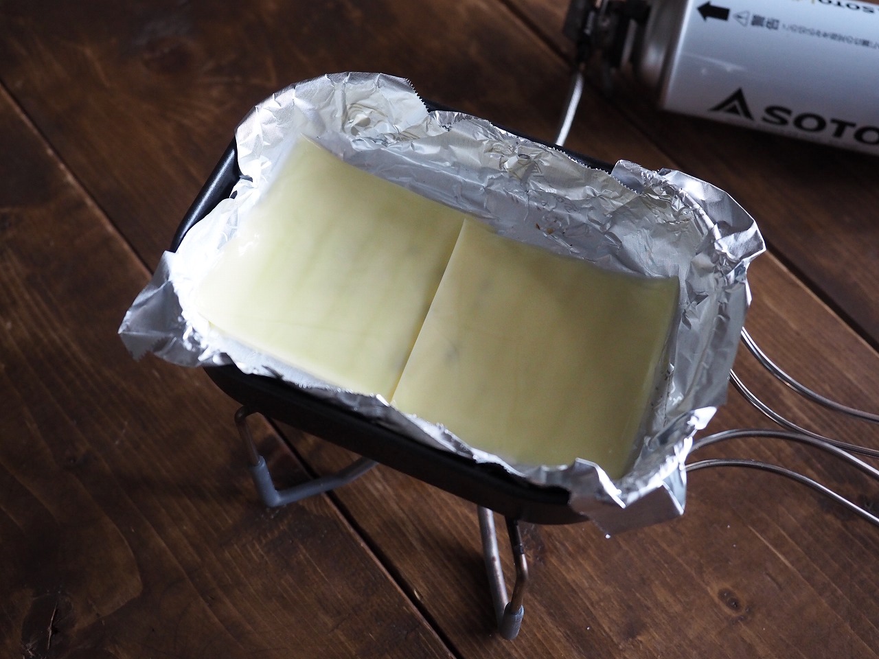 フライパンのホイルはそのままにスライスチーズを2枚並べてから……。