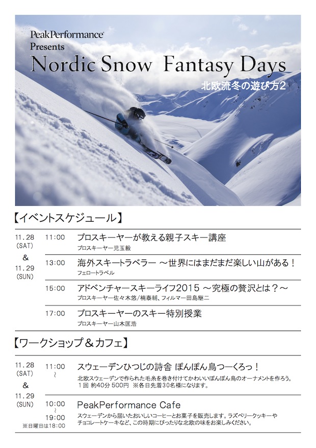 アドベンチャースキー秘話、親子スキー講座、スキーフィルム「Heart Films’ 10th Anniversary Movie – “GO WILD”」の上映会などのほか、旅行会社による世界のスキー場の紹介や、豪華抽選会など目白押し。スウェーデンのコーヒーやお菓子、子供向けのワークショップも用意されるなど、スキーをしたことがない人も楽しめる内容になっているとのこと