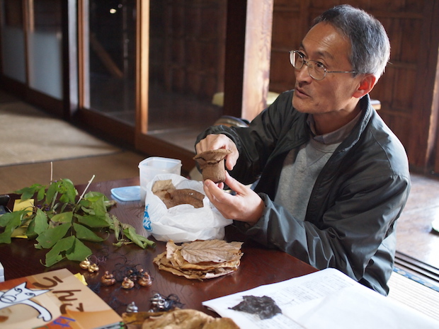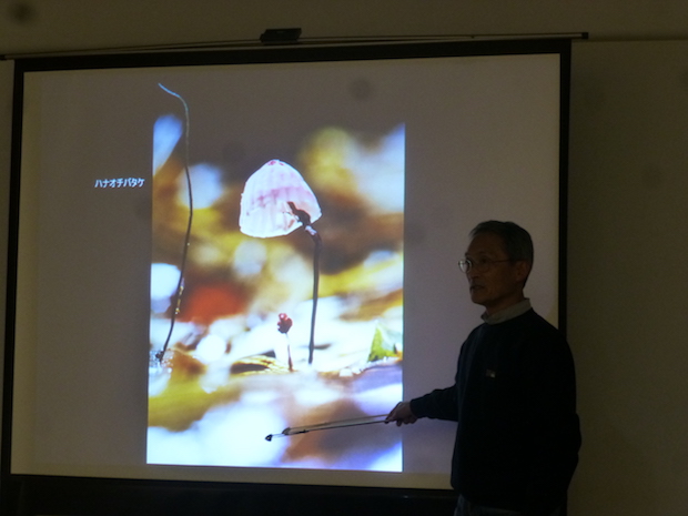 糞土師・伊沢正名さん。伊沢さんは葉っぱと水による手洗いを組み合わせた洗浄法を軸とする「伊沢流インド式野糞法」を1990年に確立。排泄後に肛門を拭く素材についても研究を深めている。写真で伊沢さんが手にとっているのは「極上の拭き心地」のノウタケ(キノコ)。伊沢流インド式野糞法については、ノグソフィアを参照のこと