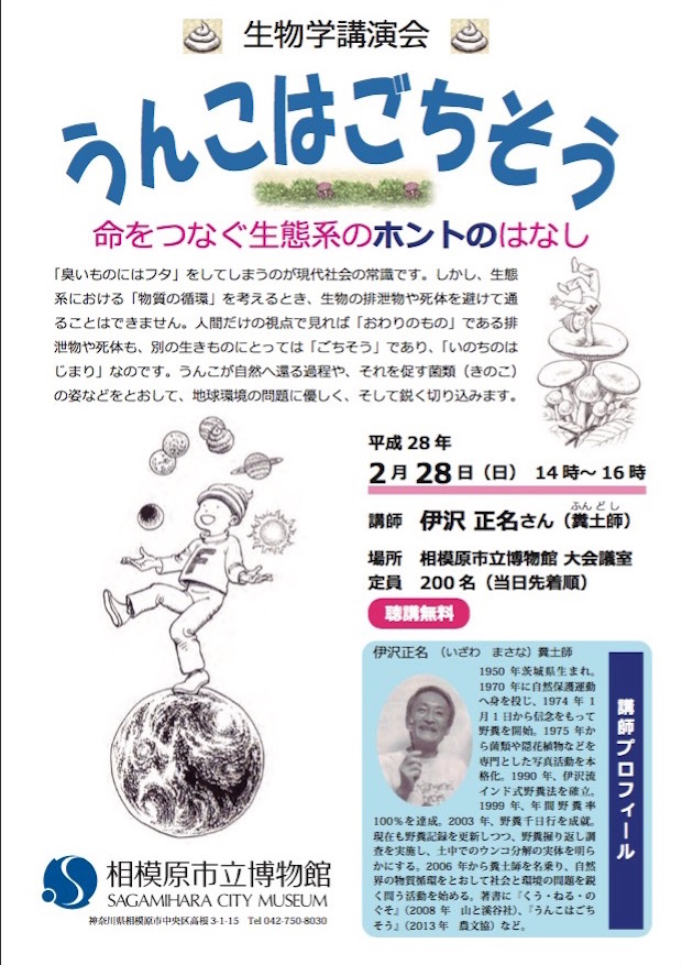タイトルはズバリ、「うんこはごちそう 命をつなぐ生態系のホントのはなし」。会場は相模原市立博物館で聴講は無料。先着200名となっている。