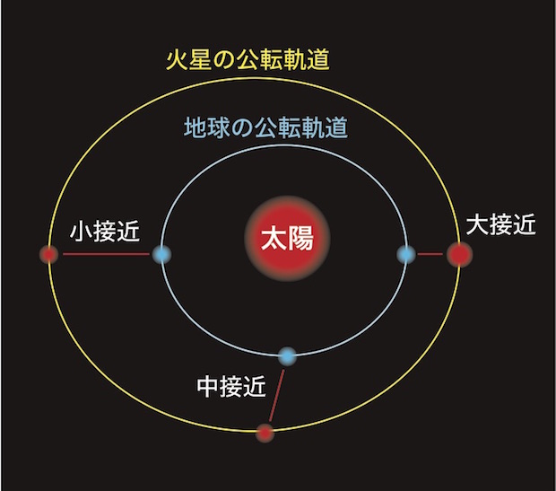 なぜかといえば、当然ながら火星と地球の距離に関係があります。水、金、地、火、木……と、ご存知のように、火星は地球の隣にある惑星です。でも、地球と火星の距離は、いつでも一定というわけではありません。