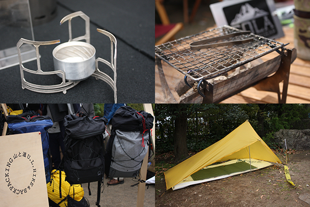 特に目立つのがUL(ウルトラライト)系だ。話題のグランピングとは対極に位置する。ULというとロングトレイルやファストパッキングなどのカルチャーかと勝手に解釈していたが、いろいろ話をしてみると、源流釣りの人たちが立ち上げたブランドもある。アプローチは違えど、めざしているところは共通するのも面白い。アルコールストーブやネイチャーストーブなどの火器類、超軽量なシェルターやテントなどなど、無駄なものを削ぎ落としミニマルな道具に最大限の効果を落とし込もうとする姿勢は、地道でストイックな行為なのかもしれないが、実際に話をしてみると、作り手本人たちはいずれもどこか飄々としていて、ものづくりのプロセスやその苦労すら面白がっているような印象を受けた。