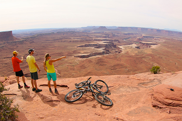 ユタ州にあるキャニオンランズ国立公園でマウンテンバイクを楽しむコンラッド一行。旅の仲間は、コンラッドの息子で写真家のマックス・ロウと画家のレイチェル・ポール。©VisitTheUSA.com