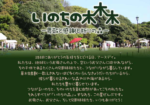 続きましては、アースデイつながりで、もうひとつのイベントもご紹介します。こちらは代々木公園のおとなり、明治神宮の森で開催されるイベントで、その名も「アースデイいのちの森2016」です。