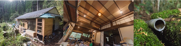 テンダーさんの住む「てー庵」。鹿児島の山中にあり、年間の家賃は1万円。水は裏山から出る沢水、電気は屋根の太陽光パネルからまかなう。トイレはおがくずを入れたお手製バイオトイレ。「トイレは数ヶ月使ってかさが増えたら畑に埋めます。臭いはまったくありません。尿と便を分ければ、不快な臭いは全然しないものなんです」