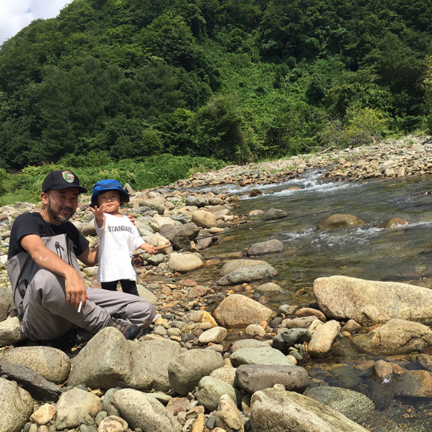 北海道の川で息子さんと釣り。スキーにトレッキング、自然のなかで家族とともに時間を過ごす。