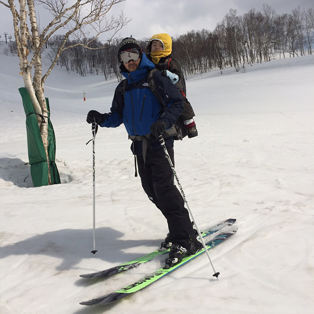 息子さんを背負ってスキーも楽しむ。スキーは子どものころから長く親しんできたアウトドアスポーツ。