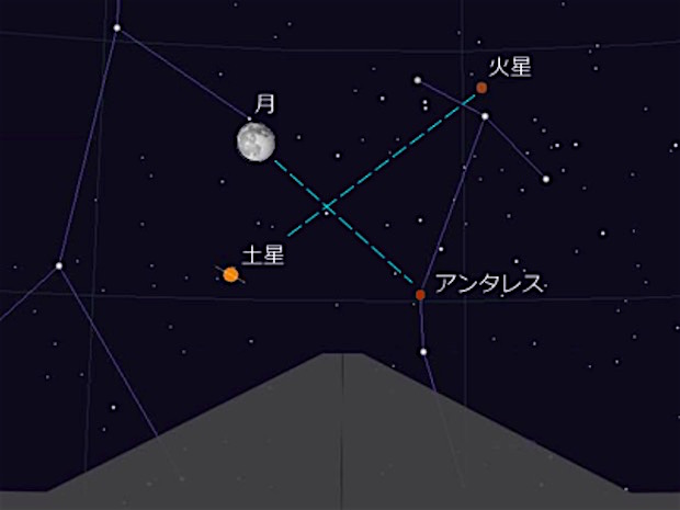 地球の衛星である月は、満ち欠けをするとともに、その見える位置も毎日大きくかわります。今回の5月22日は満月で、火星、土星、アンタレスとともに美しいクロスを描きます。