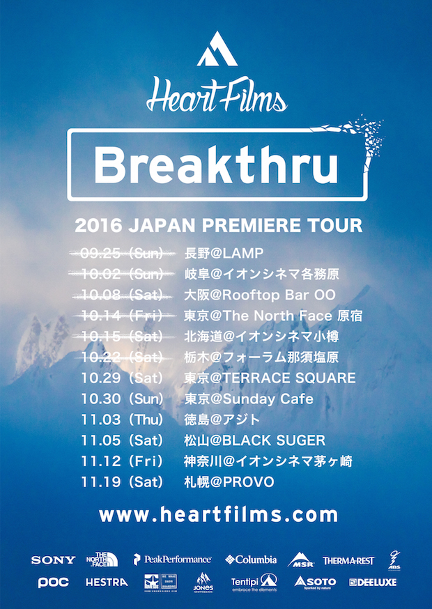 現在Heart Filmsでは、この「Breakthru」を鑑賞できるプレミアツアーを開催中。今後は東京、徳島、松山、神奈川、札幌などで出演ライダーや制作陣の生の声を聞きながら、迫力あるパウダースノーの世界にひたることができます。