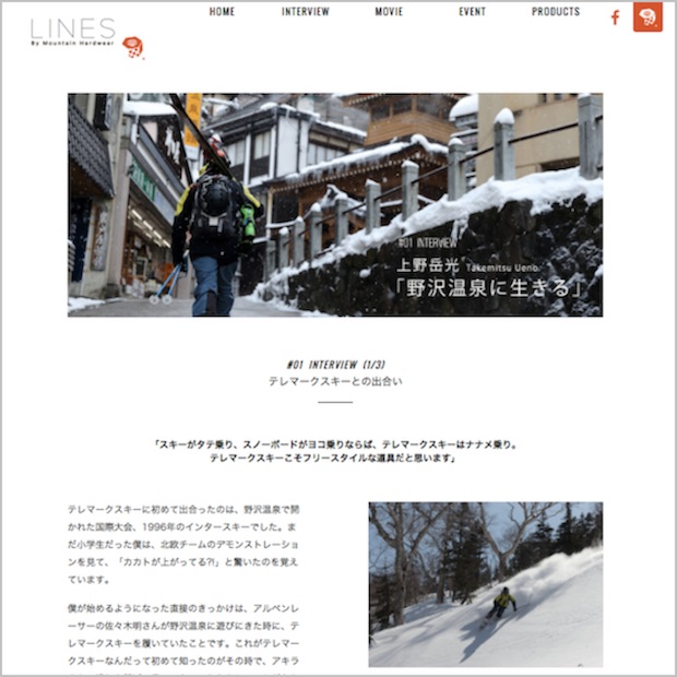 すでに公開された「LINES by Mountain Hardwear」特設サイトでは、毎週ライダーのインタビューや動画が公開され、今後はフォトブックの配布やバックカントリー講習会・ツアーの開催なども行われる模様。