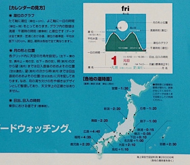 潮位の基準は東京湾の芝浦。それぞれの地域の干満の時差も示されている。瀬戸内海有明海、日本海側では、芝浦標準とは潮汐の動きがだいぶ異なるが、それでも「月のうちの大まかな潮の動き」がわかるだけでも価値が高い。