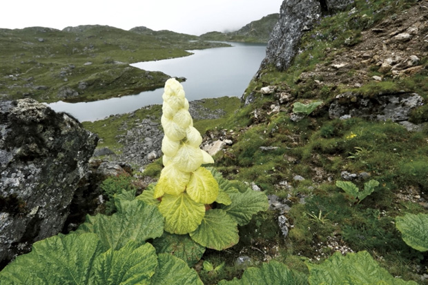 標高4500mの氷河湖畔に咲くレウム・ノビレ(セイタカダイオウ)。花は半透明の苞葉の中にある。(c)木原浩(学名:レウム・ノビレ/タデ科/ブータン・ダガラ高地)