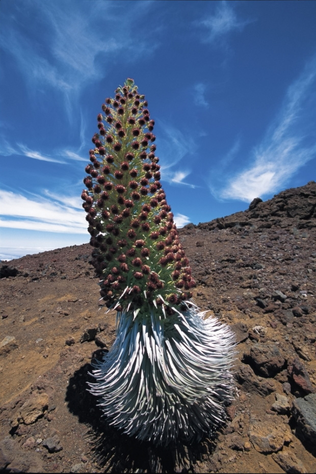 ハレアカラ火山の広大なクレーターの中の砂礫地に咲くハワイの固有種ギンケンソウ(銀剣草)。(c)木原浩(ギンケンソウ/キク科/アメリカ・ハワイ マウイ島ハレアカラ山)