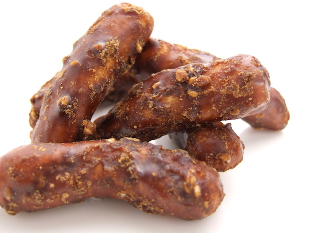 でもまぁビジュアルはともかく、原材料は小麦粉を砂糖や水、イースト、食塩などいたってノーマル(当たり前)。それらを練り上げ、棒状に形作って揚げて、蜜でコーティングしたものなんですよね。