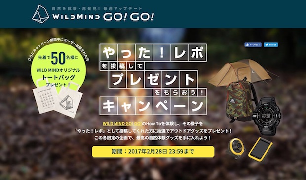 キャンペーン内容:WILD MIND GO! GO!のHow toを体験し、その様子を「やった!レポ」として投稿した人に抽選でアウトドアグッズをプレゼント。