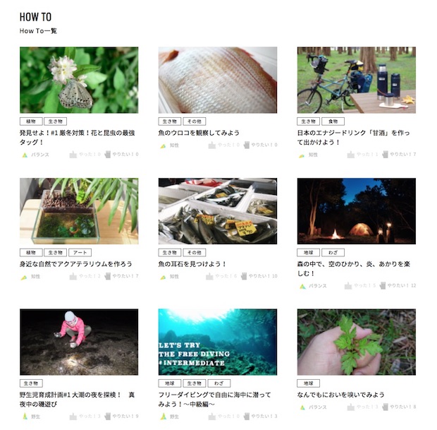 How Toの一例を挙げてみれば、「魚のウロコを観察してみよう」だったり、「なんでもにおい嗅いでみよう」「薪に火をつける」などなど。百聞は一見にしかず。このほかにもさまざまなテーマが設定されているので、まずはサイトを見てみるべし。