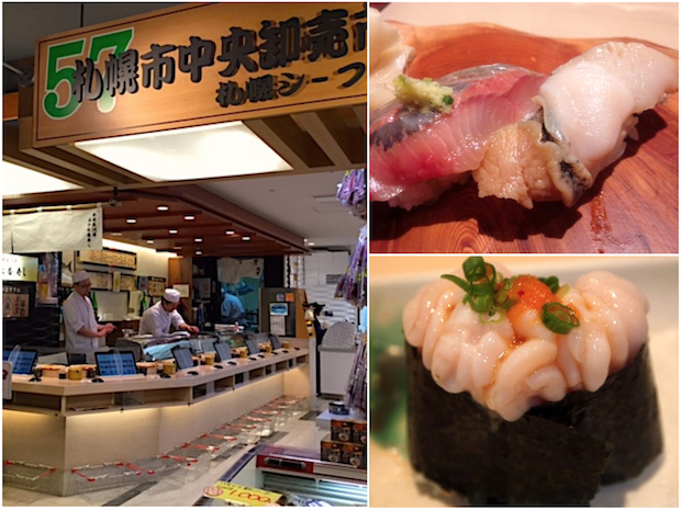 荷物を送り身軽になったら、立ち食い寿司が食べられる「札幌シーフーズ」へ走ります。「どさんこ産直市場」の一角にあるこのお店の正式名称は「札幌市中央卸売市場水産仲卸札幌シーフーズ」。つまり札幌市の中央卸売市場直送のお店です。市場の人の目で選び抜かれた新鮮な水産物はもちろん、ここの目玉はその場で食べられる旬のネタを使った立ち食い寿司。
