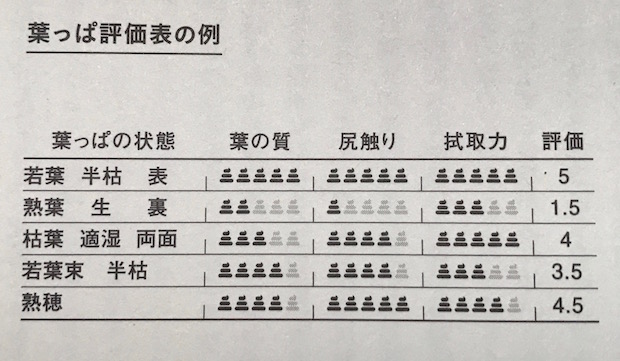 トイレットペーパーの評点が3.5のところ、評点5に輝く葉っぱはヨモギの若葉、キリの若葉の半枯、チガヤの熟穂束などなど。「うっとりするほど最高の拭き心地」とは、いったいどのような感触なのだろうか。