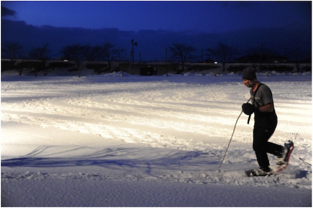 いつもはひとりで、雪の上と孤軍奮闘するサイモン氏ですが、2016年に初めて来日したときは、冬の田んぼアート開催中に天候が悪くなり、降雪もあったためサイモン氏の描いたスノーアートが見えなくなりました。そこで立ち上がったのが、メンテナンス部隊として集まっていた地元有志たちでした。地元有志は事前にサイモン氏からビギナー講習を受けていたので、その技術を駆使して、一歩一歩雪を踏みしめ、スノーアートを作成しました。