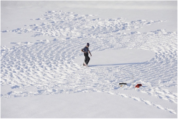 1つの作品にかかる時間は約6~12時間。その間、黙々とサイモン氏は雪の上をひとり、歩いていきます。コンパスを持ち、スノーシューを履いて、トイレ以外の休憩をほとんどとらず歩き続けること11時間。ついに、スノーアートが完成です。村人によると、サイモン氏は栄養補給にバナナを食べるくらいで、ときには半そで姿になりながら、約40kmを歩いたそうです。トイレに行くときは、模様を壊さないように同じところを歩かなければいけないのが、辛いところだとか……。