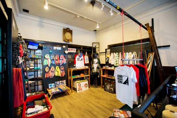 店内。山ストールの他に、キャップやTシャツなども扱う。文化財の建物だけにとても趣きがある。