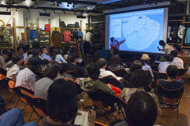 この夜は、おもに仕事帰りの方に多く足を運んでいただき、また女性が多かったのが印象的。トークイベント終盤はSkypeを屋久島とつなぎ、さまざまなエコツアーを開催する「YNAC」の小原比呂志さんから島の水の循環について話を伺ったり、森に響きわたる雨や川の音を収録した音源に耳を傾けたり……と、まさに盛りだくさんの内容に。