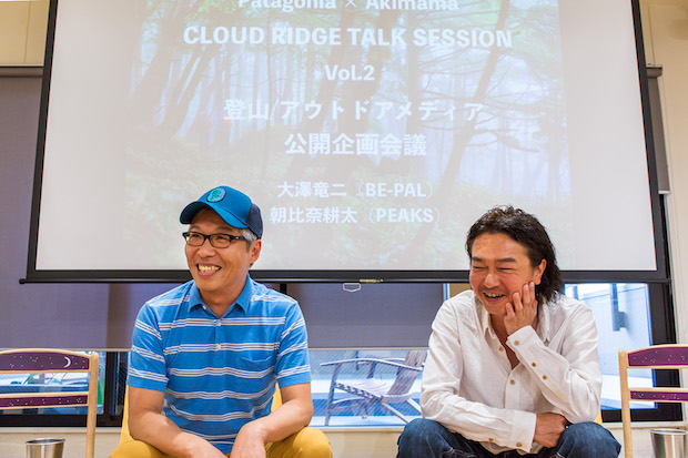 創刊から36年を数える日本のアウトドアカルチャーのオピニオンリーダーとも言えるアウトドア専門誌『BE-PAL』の編集長・大澤竜二さんと、現在の若者の登山ブームの牽引役ともなった登山雑誌『PEAKS』の編集長・朝比奈耕太さんのふたりをゲストに迎え、雑誌の編集の舞台裏に迫ってみようというのが今回の企画でした。