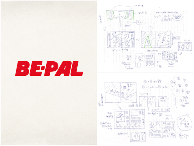 一方『BE-PAL』大澤編集長はみずからイメージを手書きし、2案考案。クラウド・リッジ・ジャケット&パンツを構成しているパーツを実寸大で掲載するという大解剖企画と、雨を題材にした日本美術や雨具の歴史と合わせ最新レインウェアについて言及するという企画だ