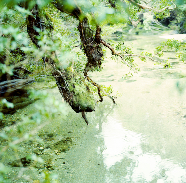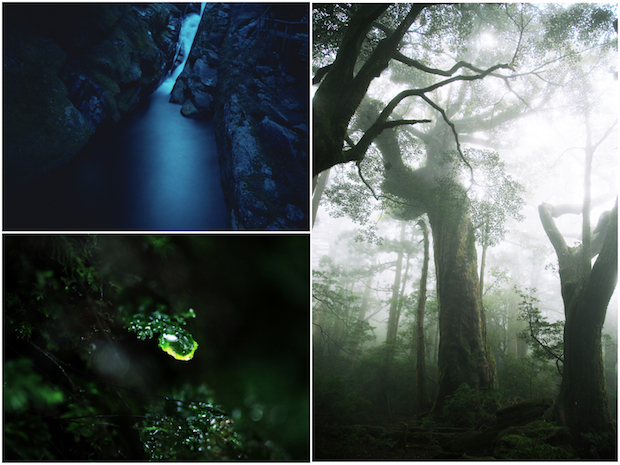 左上/青い光を帯びる日没直後の白谷雲水峡。左下/空から落ちてきたこの1滴が島を抜け海へと注がれる。右/しっとりと朝もやに包まれる屋久杉。こちらも花山歩道にて(以上、屋久島写真=田渕睦深)