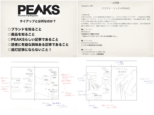 『PEAKS』朝比奈編集長は部下に企画立案の指示を出し(左上)、編集部スタッフがPEAKSらしくどう見せればクラウド・リッジ製品の魅力を伝えられるかを考案(右上・下画像)。スタッフは、高温多湿な日本の気候を掘り下げるとともに、パタゴニアアンバサダーや有名ライターを起用し、実際にフィールドでテストを行う企画などを考えた