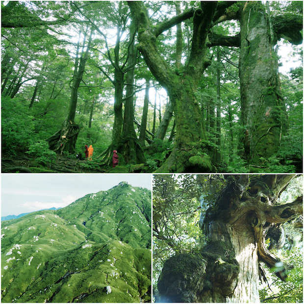 上/メジャーな登山道から外れ、名もなき大樹が乱立する花山歩道。左下/九州最高峰・宮之浦岳(1,791m)。右下/こちらも無名の縄文杉。触手のように力強く枝を四方に延ばす