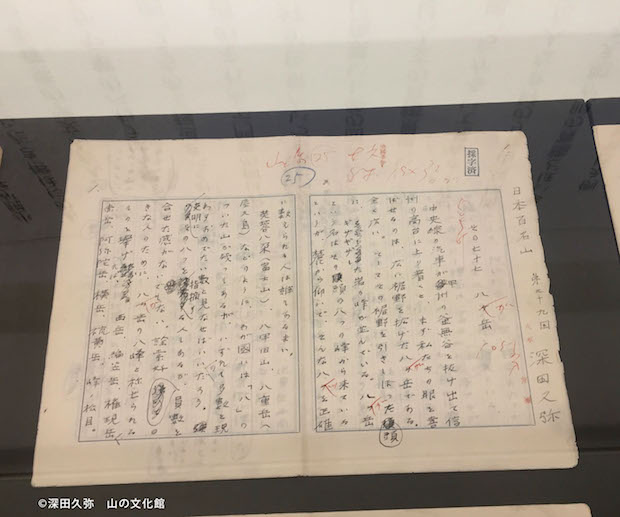 深田久弥氏は、当店のある鎌倉にも居住したこともあり、鎌倉文士のひとりとされています。じつは鎌倉は海のある街と思われますが、三方は山に囲まれており、山岳作家の方も多く居住していました。パネルには著者の作品から抜粋された文章が展示されており、ガラスケースには「山と高原」に連載していた「日本百名山」の貴重な草稿がずらりと並んでおりました。