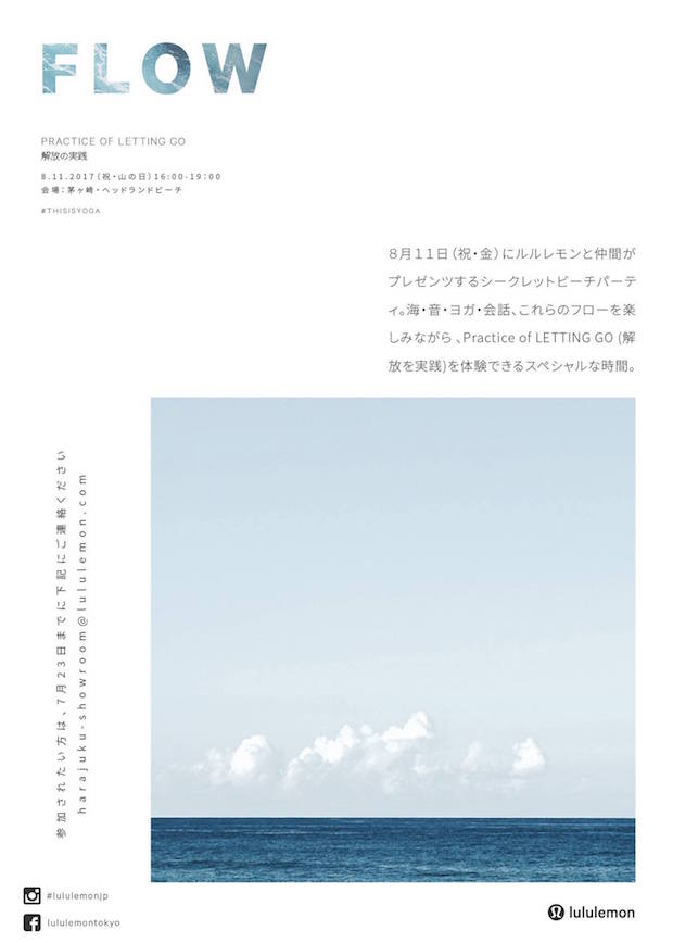 「Flow」と題されたそのイベント。主催であるブランド「ルルレモン」は、1998年にカナダ・バンクーバーにて生まれ、ヨガ、ランニング、フィットネス向けの機能性とデザイン性を兼ね備えたアパレルを主力とし、世界で400以上のストアを展開しています。日本では原宿、銀座、大阪・心斎橋に店舗出店しています。もともと僕はルルレモンの愛用者なので、今回のイベントでのDJはとてもうれしかったですねぇ。