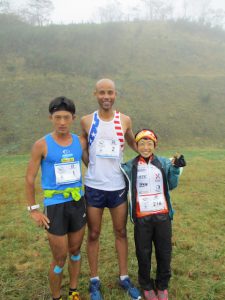 優勝したジョセフを囲んで、2017年度「スカイランナー・ジャパンシリーズ」年間チャンピオンとなった宮原徹(左)と同吉住友里の三人でフィニッシュ後に記念撮影。コングラッチレーション&グッジョブ!