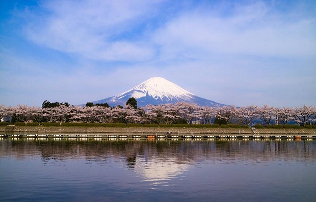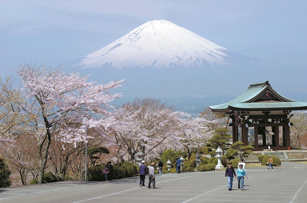 桜の木が多く植えられ、白く雪を被った富士山とピンクの桜がともに見られる御殿場の風景は、これぞまさに日本の春!
