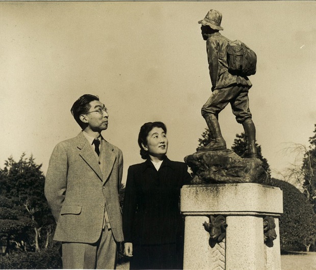 昭和天皇より送られた登山服姿の銅像を見る秩父宮殿下と勢津子妃