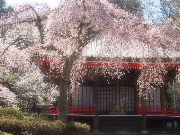 赤塗りのお堂の両脇に咲き誇る2本の枝垂れ桜が圧巻。東山湖をつくった大阪屋長右衛門が祀られている。