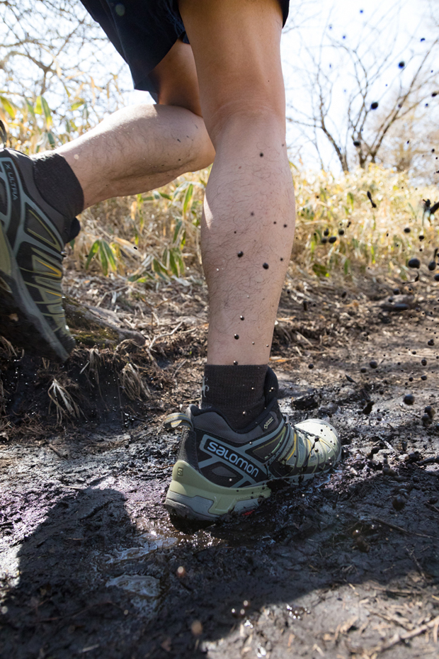 「クイックレースは、着脱もスムーズだし、歩行中も緩まず快適ですね。ゴアテックスを採用しているので、雨や泥など外部からの水分も問題なし。足蒸れも感じなかったです」とのこと。