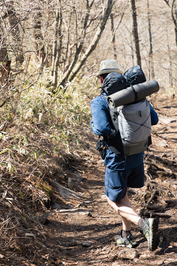 トレイルを颯爽と歩くイッセイさん。あのコンパクトな白いザックの中身を全部見せていただきました。さて、なにが入っているのでしょうか?
