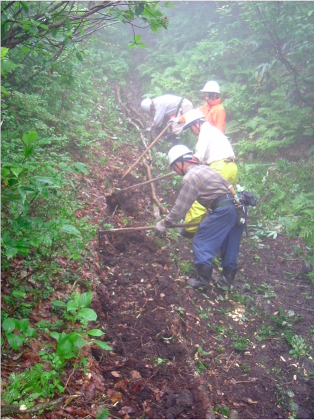 トレイル補修の一場面。雪解けが誘発する地滑りによって、階段や斜面のトラバース道はたびたび土砂ごと流されてしまう。そのため毎年、トレイル開き前には定期的な集中整備が必要となる。5mもの雪が積もる信越トレイルは、どこよりも手がかかる山道なのだ。