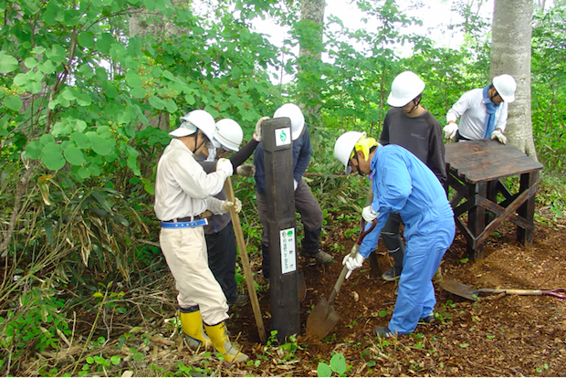 登山道が整ったら、最後に道標の設置です。信越トレイルには、開通当初設置した木製の道標が計113本あります。1本30kg以上の道標を、車が入れないところは、すべて人力で担ぎあげ、設置場所に60cmほど穴を深く掘り、埋めました。