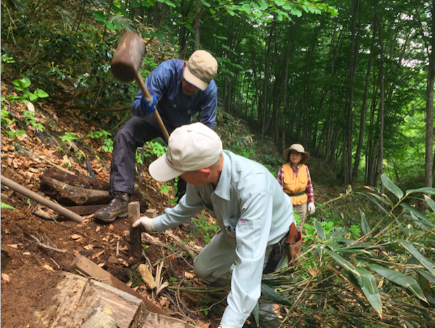 樹脂でできた擬木や製材して形を整えた木材などを持ち込んだほうが、作業は円滑に進み、登山道も長持ちするだろう。しかし、作業効率を優先することなく、多少の手間がかかっても現場で伐採した立ち木や倒木、落ち葉を利用して登山道をつくる。それは、信越トレイルの基本理念である「生物多様性の保全」を守ることでもあった。