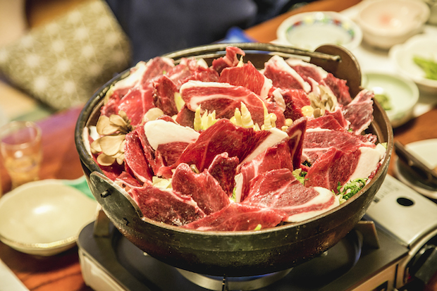 地元の猟師が獲った熊肉はまったく癖がなく、赤身はコクがあって柔らかく、脂身はさらっとしてしつこくない。だれもが熊肉のイメージを覆される一品だ。味噌ベースの鍋でいただくのが秋山流。