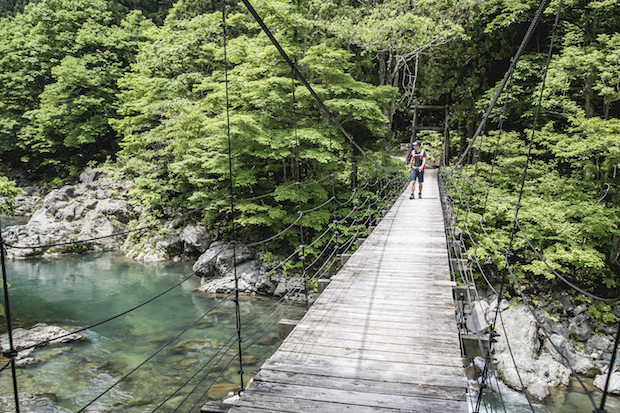 中津川にかけられた見倉橋を渡って、右岸へ渡る。オダギリジョーが主演をつとめた映画「ゆれる」の舞台となった風光明媚な吊橋だ。